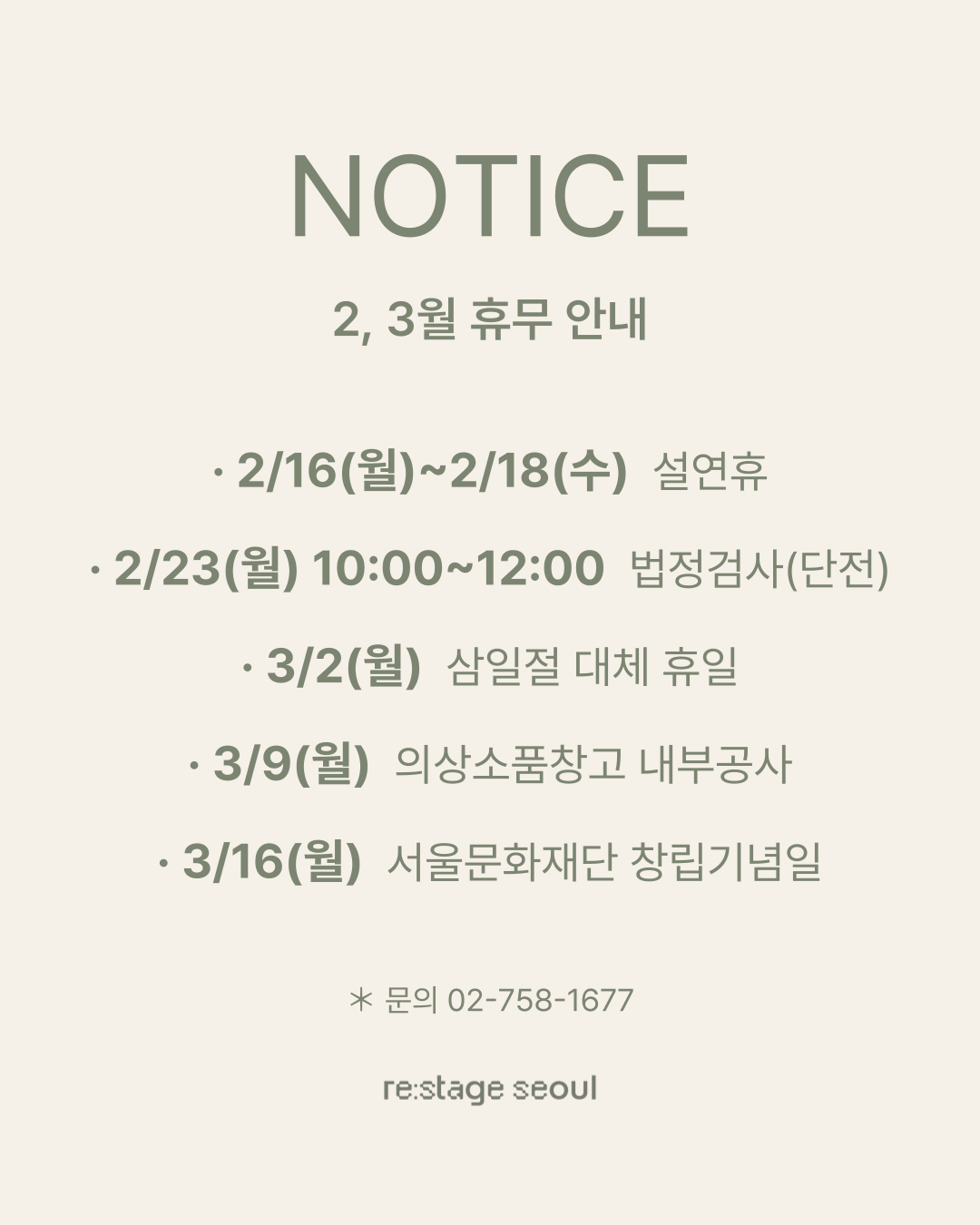 리스테이지 서울 2월, 3월 휴무일을 안내드립니다.